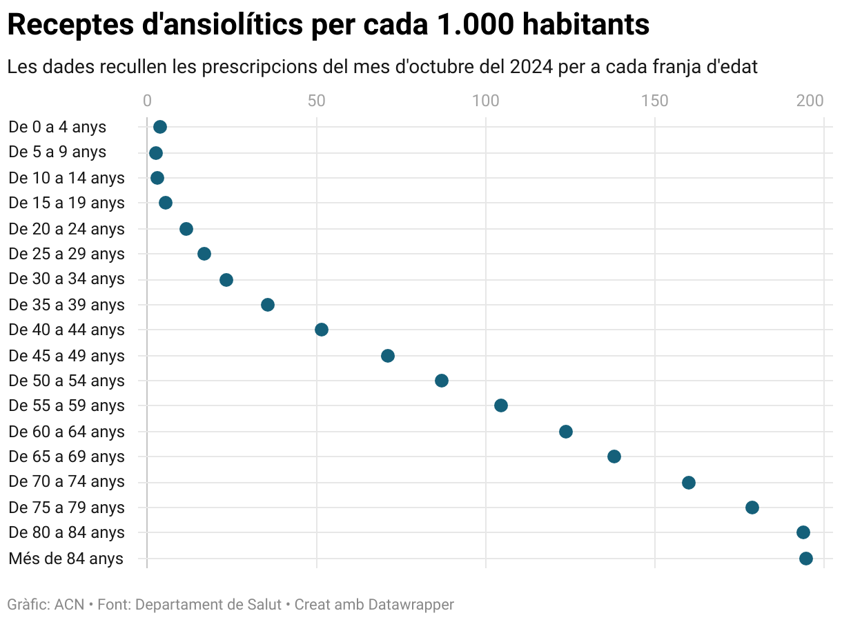 Les dades també mostren que les prescripcions són més comuns a més edat. Les persones d’entre 60 i 64 anys són les receptores de més ansiolítics, amb 61.409 el mes d’octubre –amb una ràtio de 123 per cada 1.000 habitants–, però tenint en compte el pes de cada franja d’edat, les edats més avançades són les més consumidores dels fàrmacs. Entre els ciutadans de més de 70 anys, les prescripcions aquest octubre han arribat a més de 150 per cada 1.000 habitants, més del doble que la mitjana.