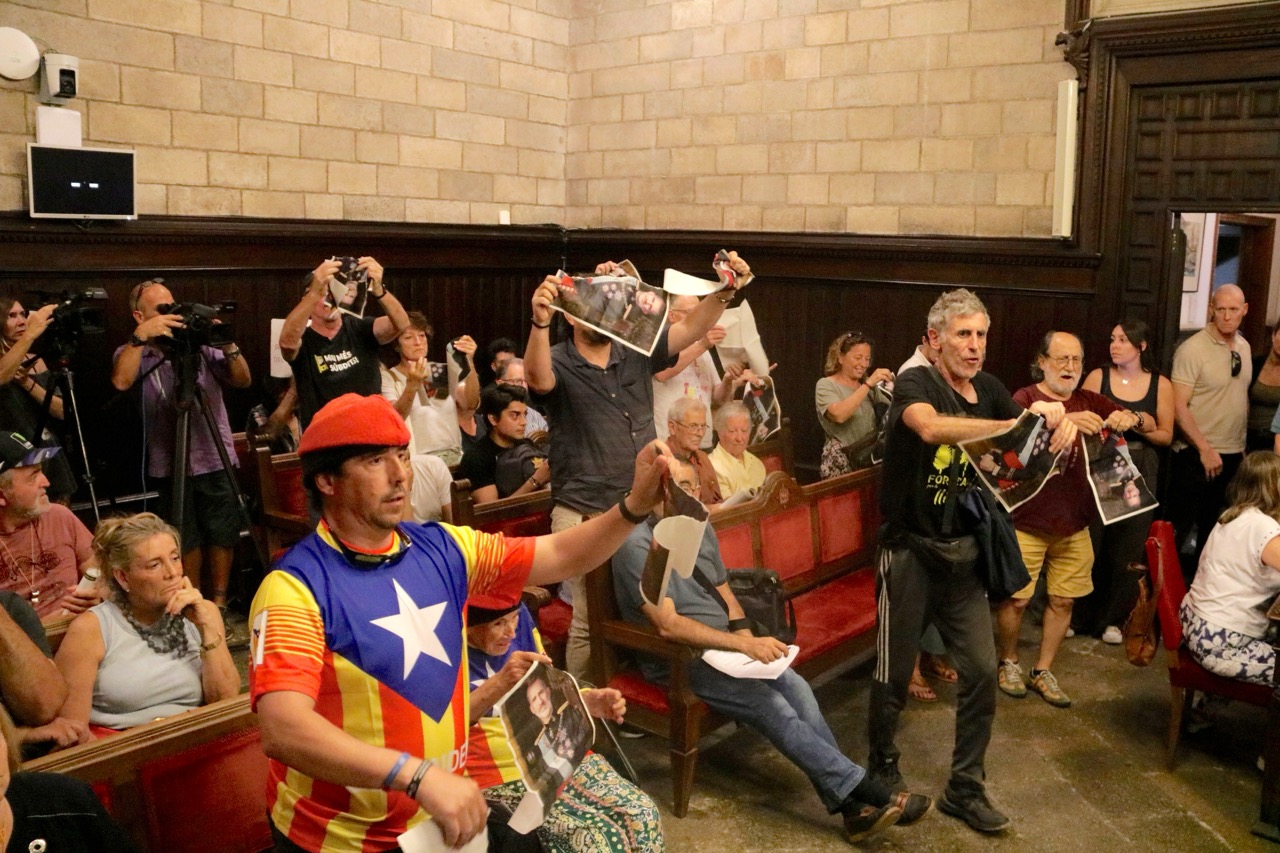 Durant la seva intervenció, membres de col·lectius antimonàrquics presents al ple han insultat el regidor de Vox (de fet, a un d’ells se l’ha expulsat de la sala). I després de la votació, alguns d’ells han estripat fotografies de Felip VI a la sala de plens i n’han deixat els retalls davant la taula on s’asseu Domínguez. Mentrestant, a fora, una vintena de persones han cremat fotografies del rei a la plaça del Vi.