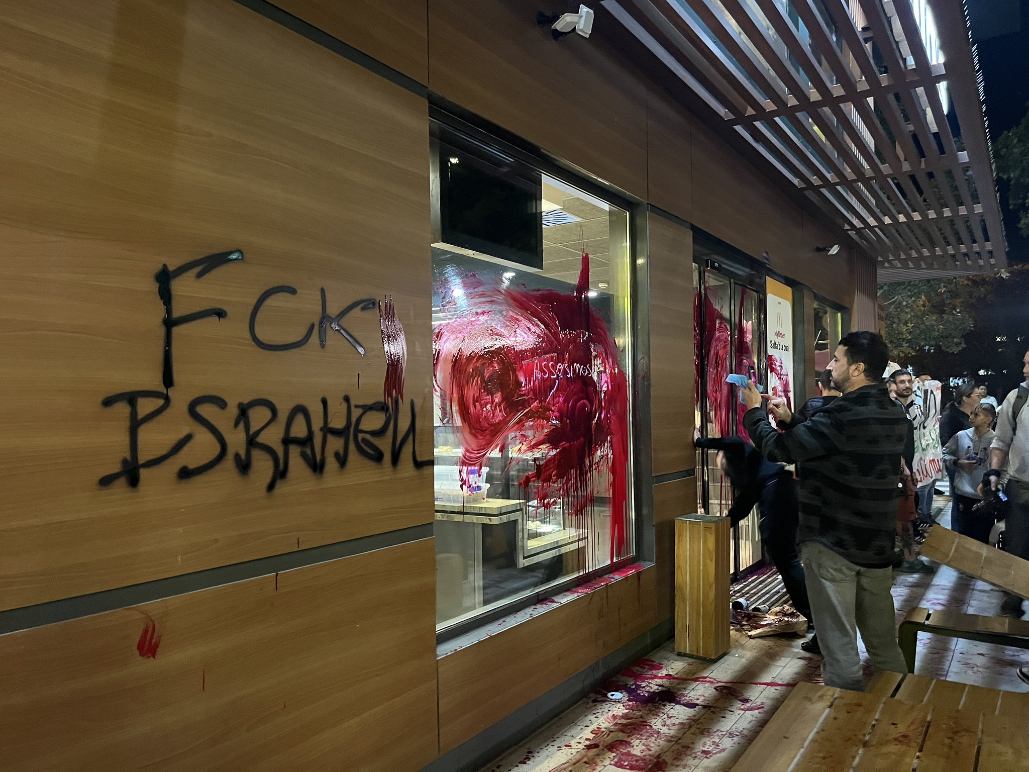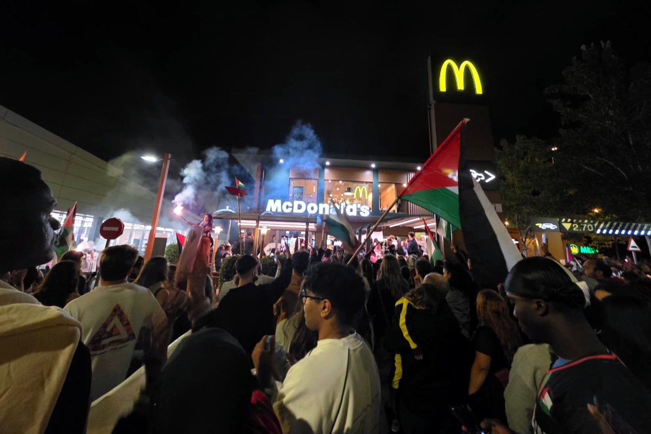 Unes 1.500 persones s’han concentrat aquest vespre a Girona per reclamar l’alliberament dels membres de la Flotilla i la fi del genocidi a Palestina. La mobilització ha començat a la plaça del Vi i ha continuat pel centre de Girona fins a dirigir-se al McDonalds de l’avinguda Josep Tarradellas al crit de “Boicot a Israel” i “Visca Palestina lliure”. Alguns dels participants han malmès mobiliari i han embrutit de pintura vermella els vidres de l’establiment.