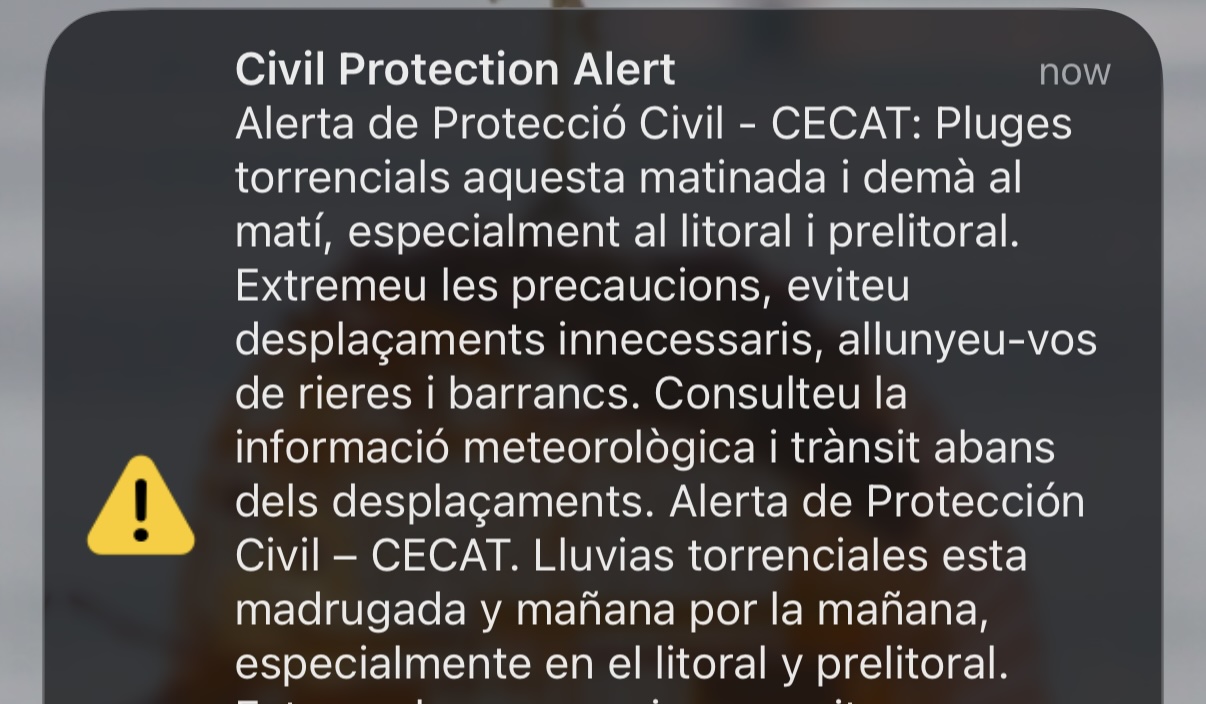 Protecció Civil ha enviat aquesta nit un missatge ES-Alert per la previsió de pluges torrencials a bona part de Catalunya. Ho ha avançat unes hores abans la consellera d’Interior, Núria Parlon, en una compareixença en què ha demanat “màxima precaució” davant d’un episodi de grau 4 sobre 6 en què es poden acumular entre 40 i 60 litres d’aigua per metre quadrat en mitja hora.