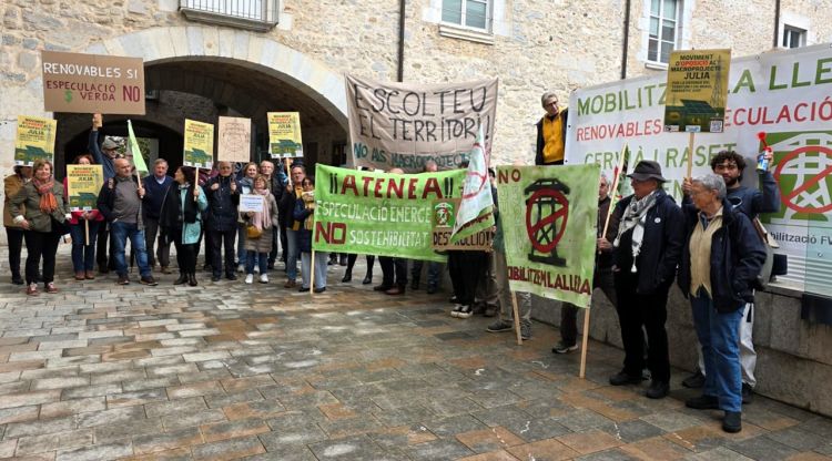 Aprofitant que aquest divendres s’havia de celebrar la trobada entre els alcaldes, l’empresa i la Generalitat; la plataforma ‘Mobilitzem la llera’ ha convocat una protesta davant la seu de la Generalitat de Girona. Una trentena de veïns de les nou poblacions han mostrat el seu rebuig amb proclames com “Renovables sí, així no”, “No especuleu amb el territori” o “Escolteu el territori”.
