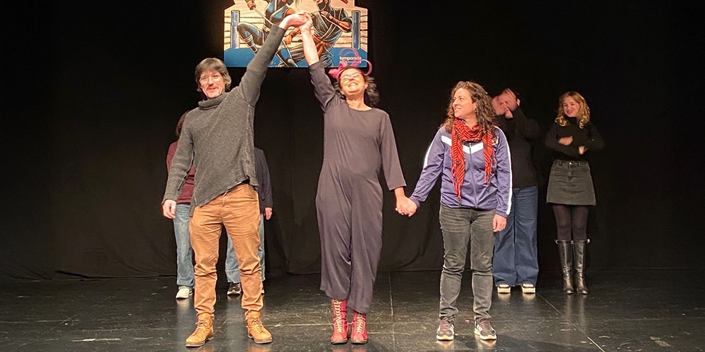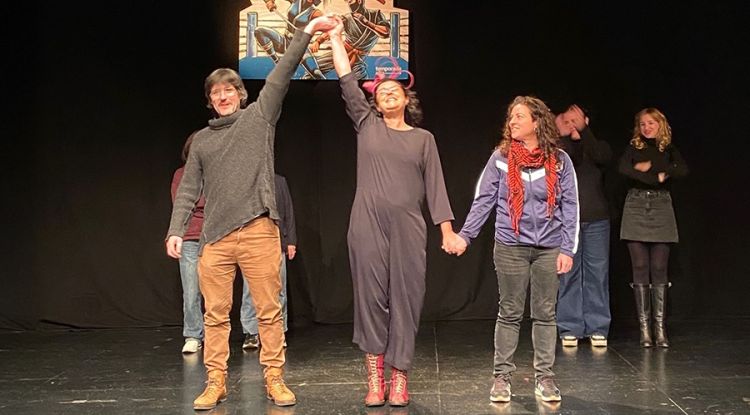 Per la seva banda, Mertxe Aguilar va presentar la proposta De bufons, fangs i cendres, interpretada per Anna Moliner i Júlia Truyol, una peça que parteix de la conversa entre dues dones que es preparen per a la defensa d’un judici.