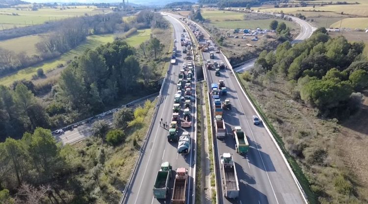 Més d’un centenar de tractors ocupen des de les tres de la matinada d’aquest dijous prop de dos quilòmetres de l’AP-7 en els dos sentits de la marxa. Els pagesos han muntat una porxada amb estructura de ferro que han fixat a la mateixa carretera. També han tallat les tanques, han col·locat pneumàtics i bales de palla, a mode de barricada. Després d’esmorzar, han fet diverses assemblees, un vermut amb musclos i han dinat carn a la brasa.