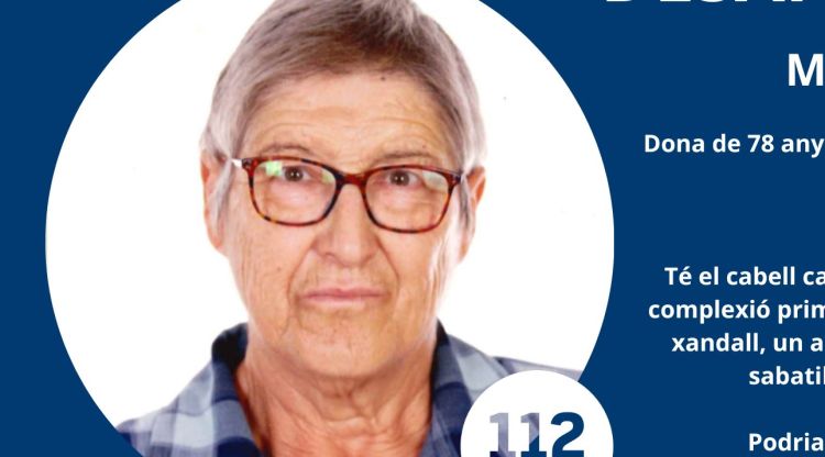 Segons les dades facilitades, la dona fa aproximadament 1,70 metres d’alçada, és de complexió prima i té els cabells canosos. La darrera vegada que va ser vista vestia pantalons negres de xandall, un abric de color caqui o marró i sabatilles d’estar per casa.