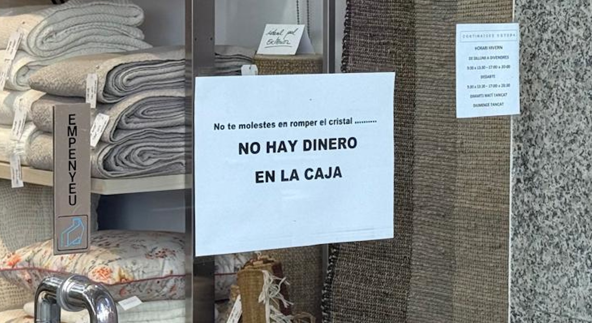 La situació ha derivat en reunions amb els Mossos d’Esquadra i la Policia Local i els comerciants per tal de tractar el tema i rebre consells. Més enllà de les recomanacions, però, la situació ha portat els comerciants a engegar iniciatives enginyoses per intentar dissuadir els lladres. Una ha estat la de col·locar cartells a l’entrada dels locals advertint els lladres que no hi ha diners a la caixa i que, per tant, no cal que es molestin a trencar el vidre.