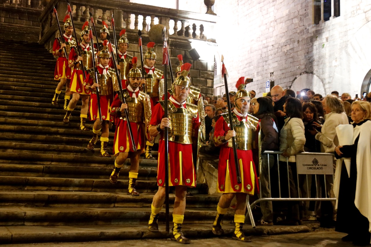 Fidels a la tradició, els 120 Manaies, els soldats de la milícia romana, han començat a descendir l’escalinata de la Catedral quan les campanes tocaven les nou del vespre. Aquest cop, i per primera vegada, els maniples no han picat amb les llances els graons a mesura que els anaven trepitjant. Sí que ho han fet, però, quan caminaven pels diferents replans.