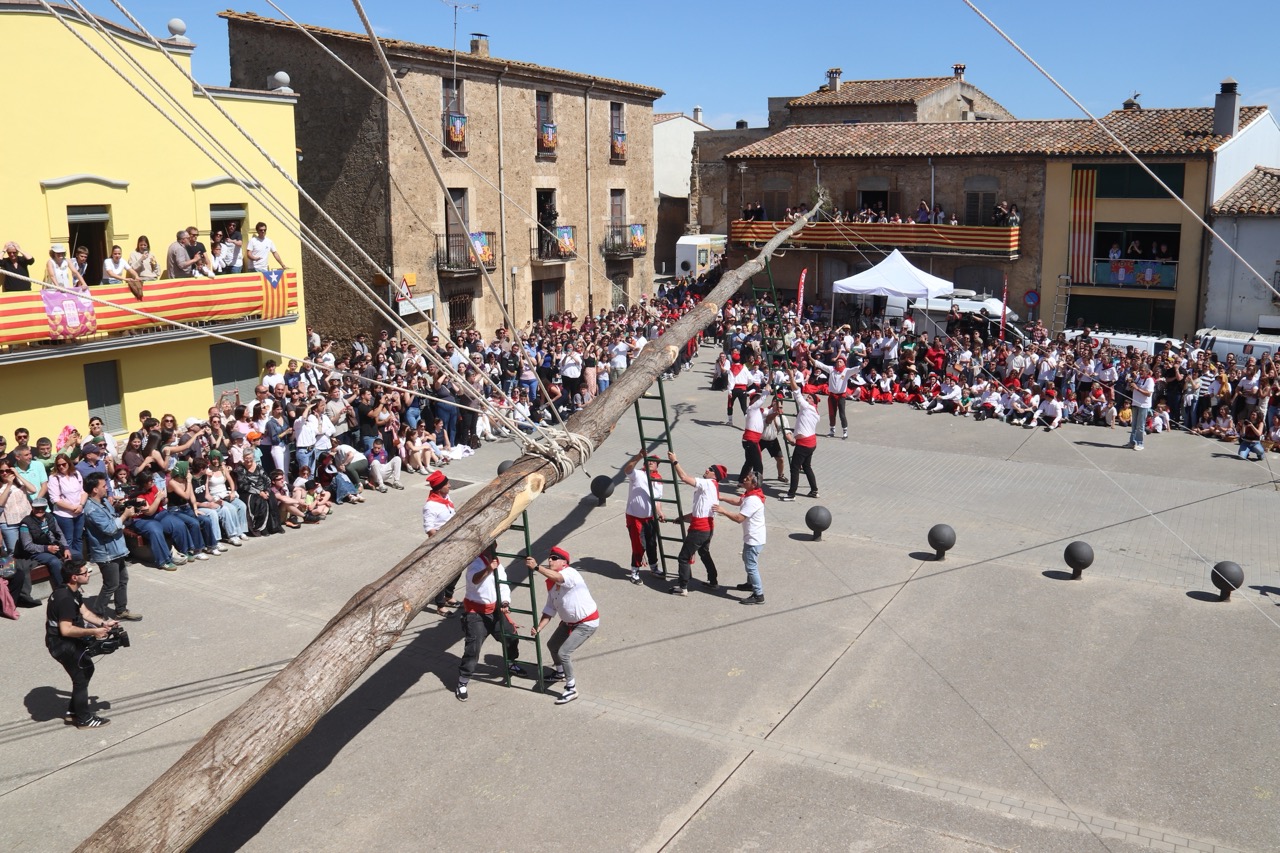 No ha estat fins a tres quarts de dues del migdia que l’arbre ha arribat a la plaça, amb els aplaudiments de tots els espectadors que l’esperaven. Una vegada allà, els voluntaris l’han lligat amb cordes que feien la volta a unes politges instal·lades a la façana del Centre Cultural i tornaven a la plaça on els voluntaris feien força per aixecar-lo.