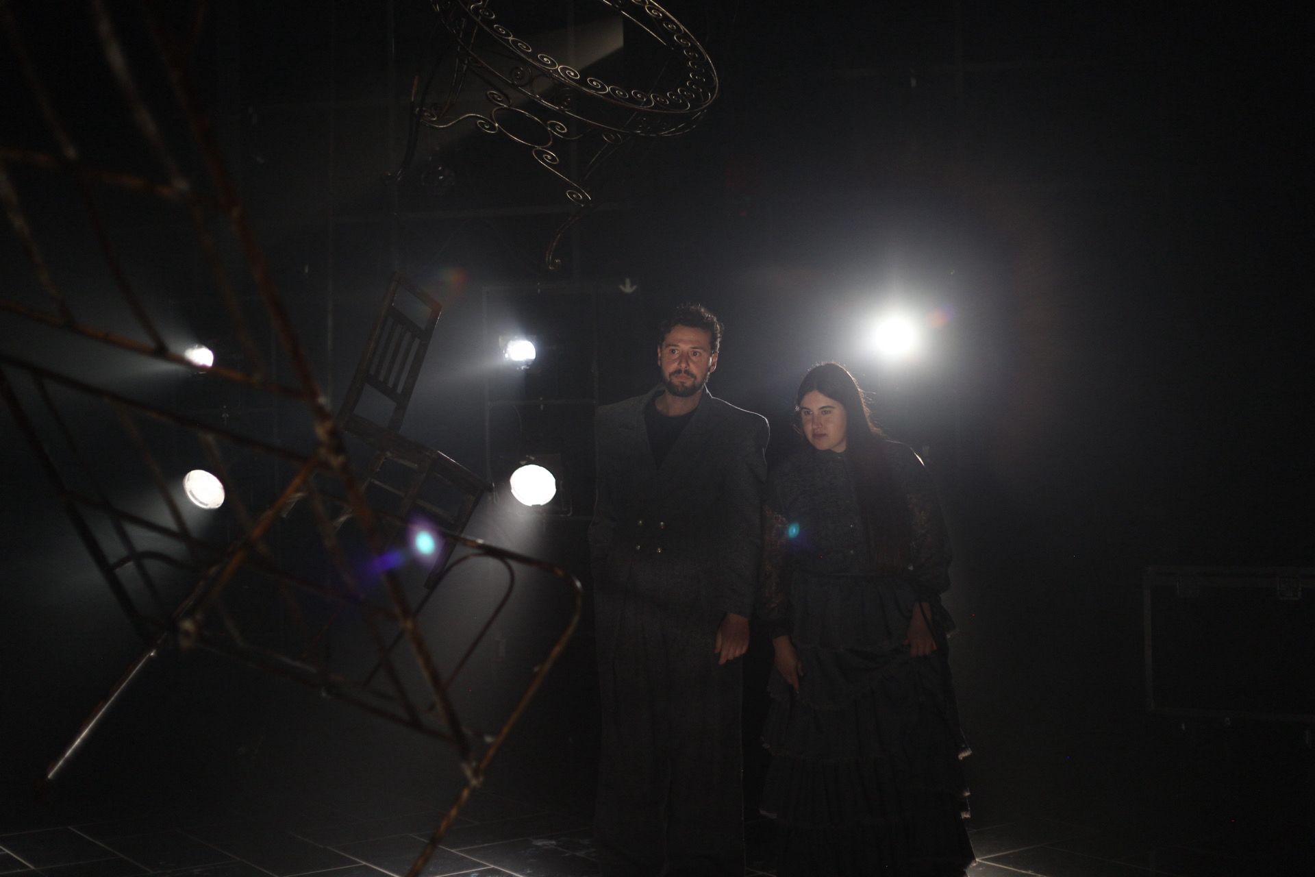En un replà que no pertany a cap edifici concret i, alhora, podria ser l’avantsala de qualsevol pis, 'On s’acaba el nom' aixeca una escena feta de restes: esquelets metàl•lics de somier i capçaleres de llit, el perfil d’un sofà, una taula, una cadira, un mirall. Són fragments domèstics convertits en arquitectura mental, com si el muntatge proposés una llar desossada i reordenada segons les lleis d’un record: no hi ha realisme d’interiors, sinó una instal•lació abstracta. Predominen els foscos —negres, grisos, tonalitats apagades—, però el dispositiu es matisa amb reflexos: el terra, el metall i el mirall retornen la llum en punts i vores. També el moviment està calculat amb una precisió coreogràfica: gestos recurrents, trajectòries circulars, accions que recomencen com un ritual. Aquesta repetició corporal dialoga amb la del text: la paraula torna, varia i insisteix, per trobar sentit.